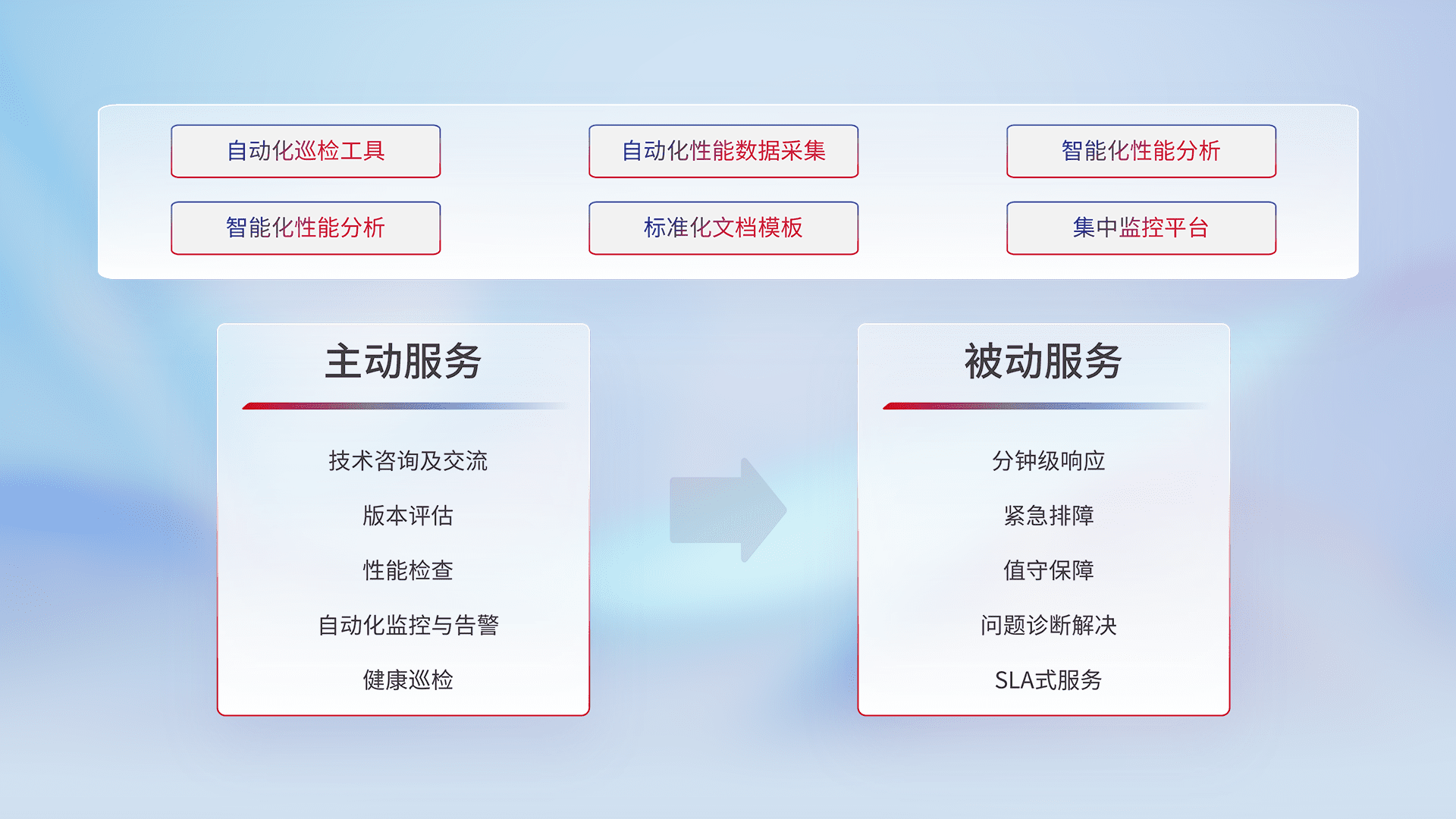 智能化工具和标准化文档,,,,保障服务质量,,提供主动服务(包含技术咨询、、、版本评估、、、、性能检查、、、、自动化监控与告警、、、健康巡检)和被动服务包含(分钟级响应、、、紧急排障、、值守保障、、、、问题诊断解决、、、、SLA服务)。。。